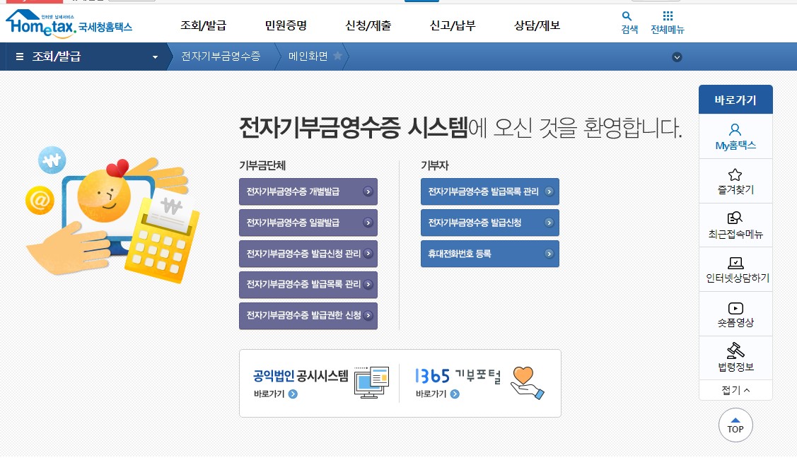 국세청홈택스(https://www.hometax.go.kr/)-조회/발급-전자기부금영수증-메인화면(로그인해야 입장가능)