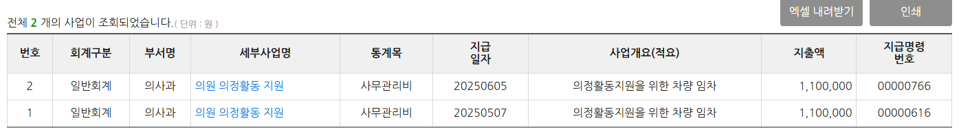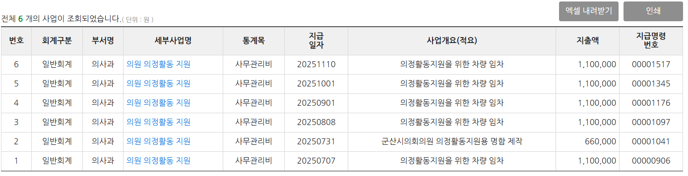관용차 운영 예산을 보면 의회사무국-기본경비-일반운영비-사무관리비에서 지출되고 있다. 그런데 사무관리항목에는 관련항목은 없다. 아마 ‘기타 의회운영 사무관리비’명목으로 5월~11월가 지급된 것으로 보인다. 다른 용도로 사용될 수 있는 예산이 ‘전기차 관용차’가 무섭다는 이유로 쓰이면서 필요한 예산이 부족할 수 있을 듯 하다. 아니면 2026년 예산에서는 기타사무관리비를 삭